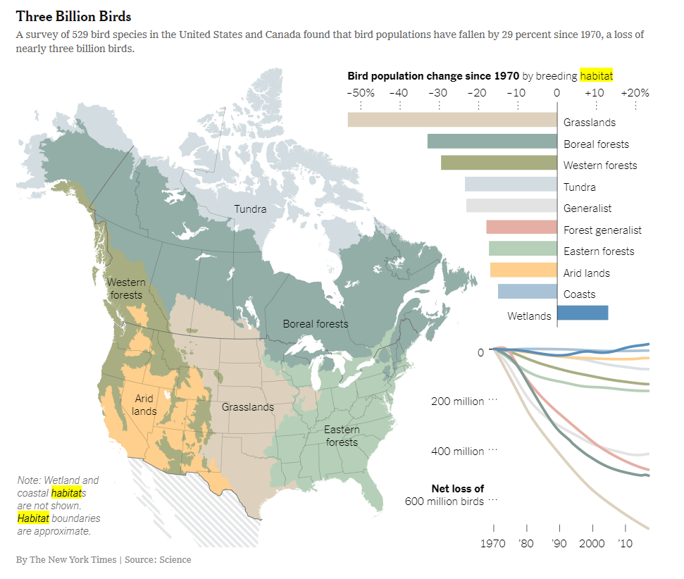 Here is a nice map of bird loss by habitat since 1970 via the New York Times.