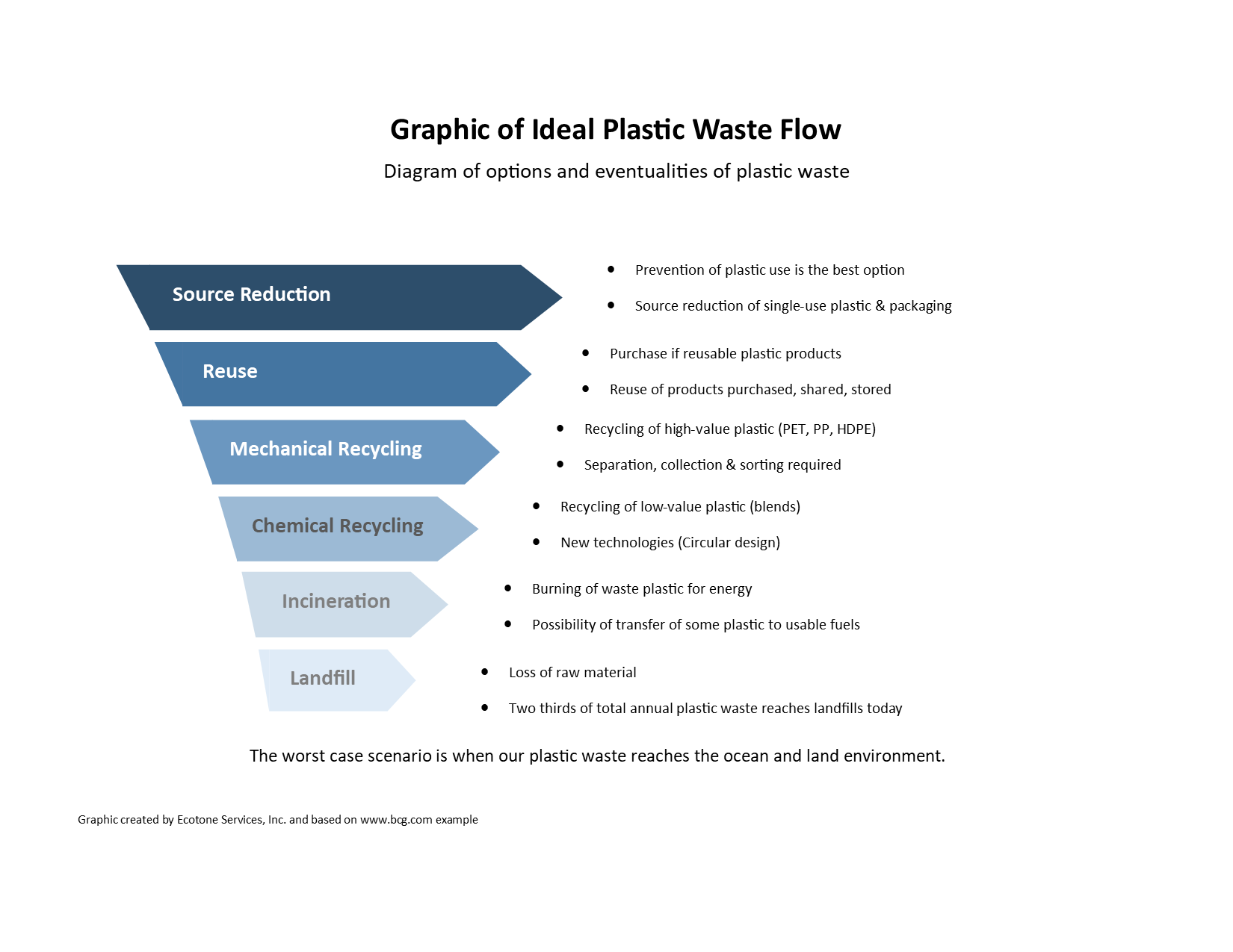 The ideal plastic waste stream would start by the limited use of single-use plastic, such as convenience items (single-use utensils, bottles, plates and containers). Then by incorporating reuse options and finally, smart recycling practices we could reduce our plastic waste and reach the original promised goals of this versatile product.